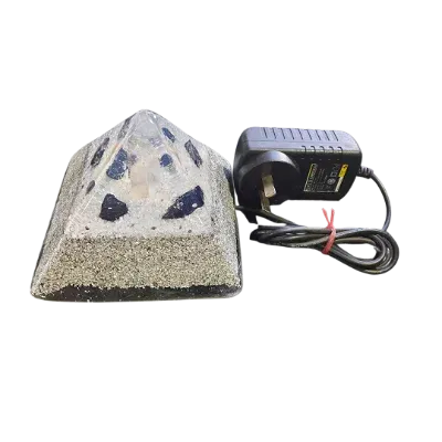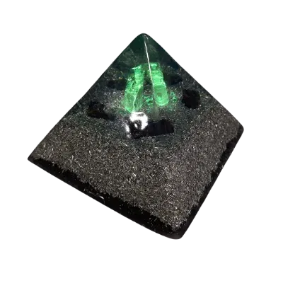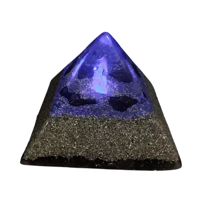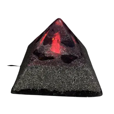 Pirámide de orgonito ideal para ambientar una habitación, un consultorio para terapias. Especial para meditar sobre la luz cambiante que irradia el cristal, al ser iluminado con un baño de colores. La luz emitida por el cristal es suave, para contemplarla sin agotar la vista, al estar filtrada por el cristal y la resina. Puede ser usada en cromoterapia.