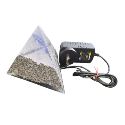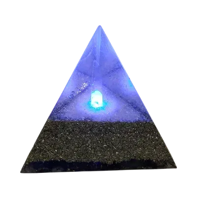 Pirámide de orgonito ideal para ambientar una habitación, un consultorio para terapias. Especial para meditar sobre la luz cambiante que irradia el cristal, al ser iluminado con un baño de colores. La luz emitida por el cristal es suave, para contemplarla sin agotar la vista, al estar filtrada por el cristal y la resina. Puede ser usada en cromoterapia.